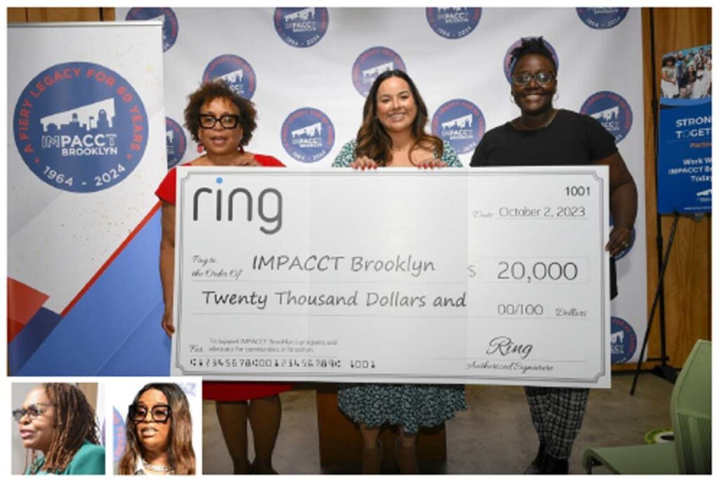 Thanks to a new collaboration announced Monday between IMPACCT Brooklyn, a nonprofit committed to helping residents and small business flourish in the community, and RING, maker of video doorbells, 200 small businesses will be the recipients of device bundles (Alarm Kit, Stick Up Cams, and an Alarm Glass Break Sensors) at no cost, plus a free lifetime Basic Protect subscription for the camera devices and a one year trial subscription for the alarm device at no cost to the small business. Also at the announcement event, IMPACCT was the recipient of a donation of $20,000 for its ongoing business’ empowerment and community services. Seen, above, holding check are, from left to right, Bernell Grier, Executive Director of IMPACCT Brooklyn, Raquel Medrano Community Engagement Manager - Amazon Devices and Services, IMPACCT Brooklyn Naila Moore, Chief Development Officer and, in photo insets, Assembly member Stefani L. Zinerman (inset, left), representing the 56th Assembly District, Bedford Stuyvesant and Crown Heights, and Anita Taylor (inset, right), District Director at Congresswoman Yvette D. Clarke’s office, who spoke on behalf of political leader Clarke.