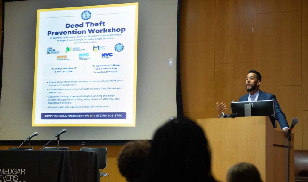 Brooklyn Borough President Antonio Reynoso hosted a Deed Theft Prevention Workshop at Medgar Evers College last week with Brooklyn Legal Services and Grow Brooklyn to help Brooklynites protect themselves against deed fraud. Deed theft, the fraudulent acquisition of property without a homeowner’s knowledge or consent, has become a rampant issue in Central Brooklyn where there is a large concentration of elderly homeowners and homeowners of color.
