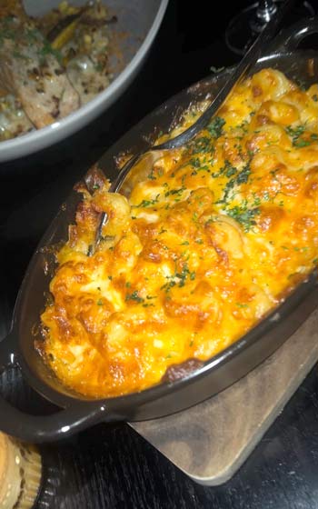 The Oxtail Lo Mein was stellar. While the serving size of the appetizer bao bun left me wanting more, the main dish gave me more than enough delicious, savory pulled oxtail. The tender, flavorful meat lay on a bed of lo mein and vegetables that was not greasy and perfectly soft. The Pan-seared salmon was served with callaloo gnocchi, sitting in a heavenly beurre blanc (a white wine butter sauce), carrots, and corn. The table split a side of mac and cheese, made with three cheeses, of course, that I am still dreaming about. These signature plates, and the menu as a whole, are a quiet flex of Executive Chef Innis’ Caribbean upbringing and Le Cordon Bleu pedigree.